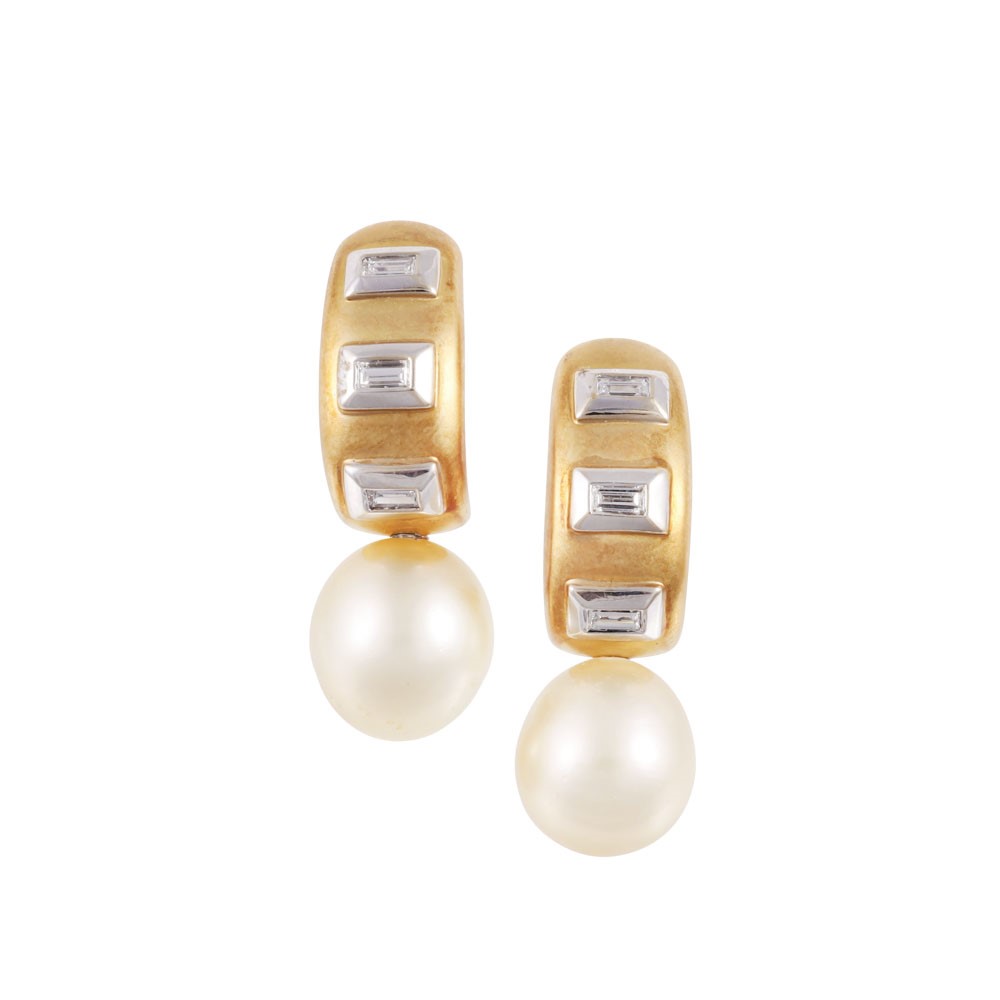 a semicerchio in oro giallo 18Kt satinato e oro bianco con diamanti taglio baguette disposti in linea e perla South Sea terminale, gr. 19,9.