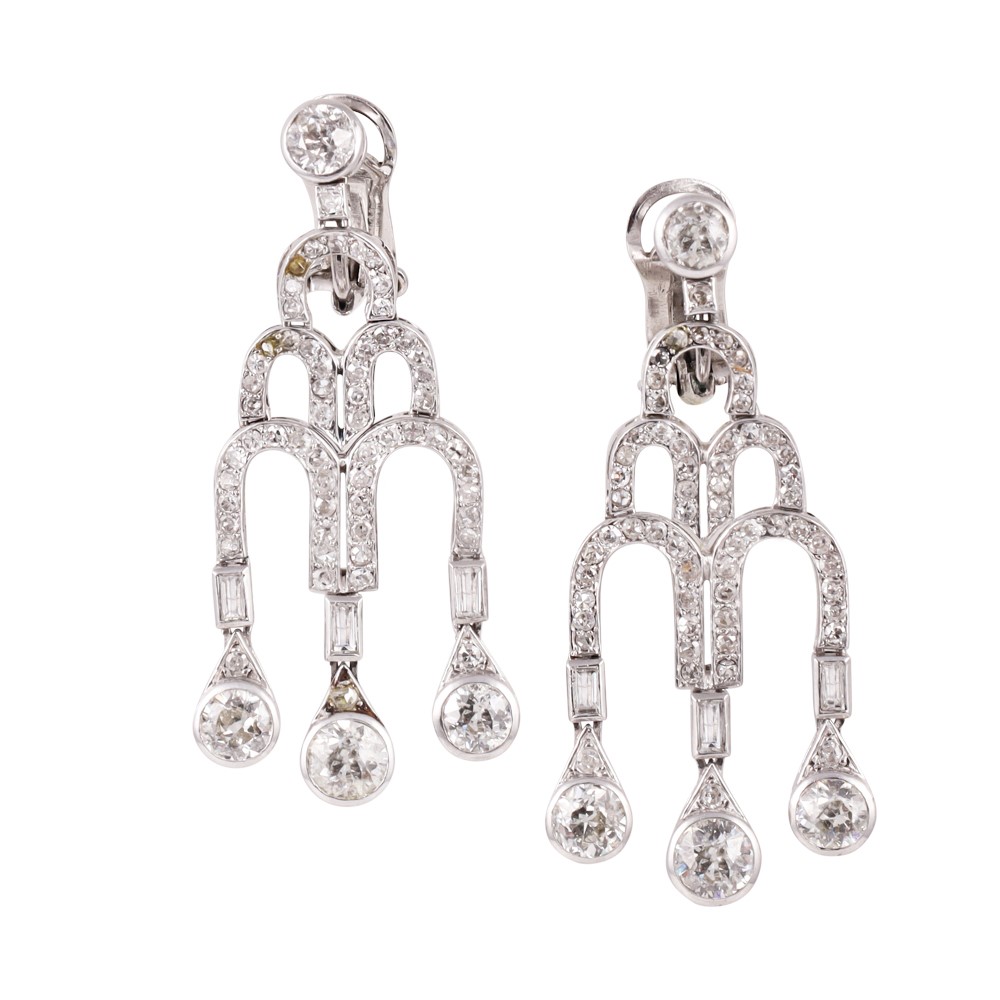 pendenti a clip in platino, ciascuno con motivo a cascata in diamanti, di cui tre terminali di dimensioni maggiori, gr. 13,1.
