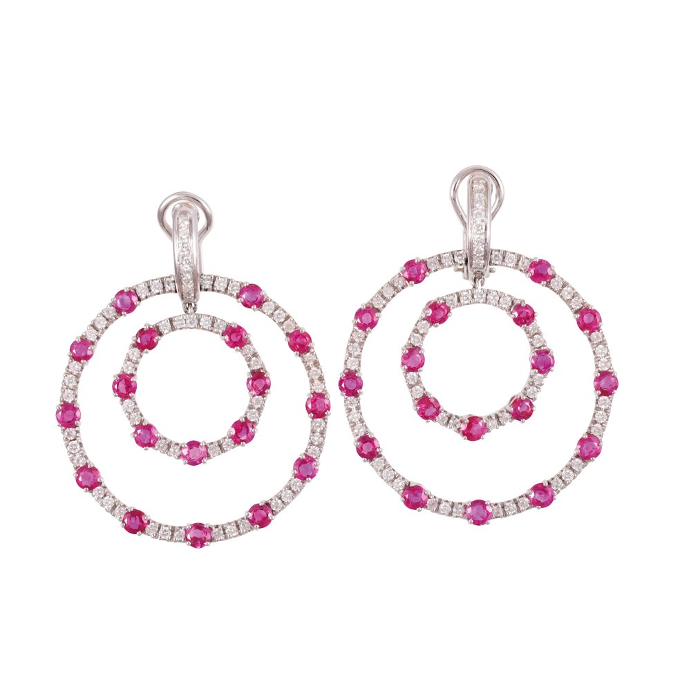 a clip pendenti, in oro bianco 18Kt, composti da cerchi concentrici impreziositi da brillanti del peso complessivo di 2,70 ct ca. e rubini, gr. 30,9.