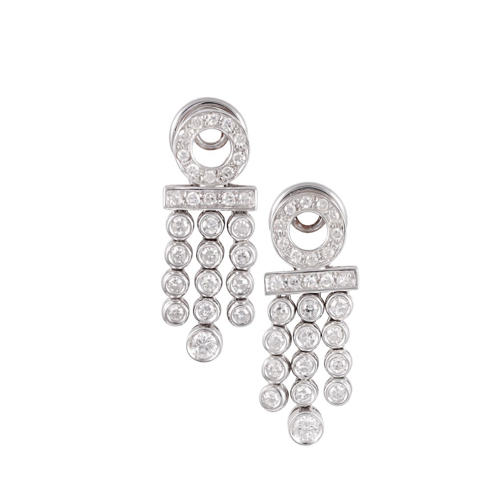 a clip, in oro bianco 18Kt e diamanti, ciascuno con motivo superiore circolare a sostegno di tre morbide rivière, gr. 8,7.