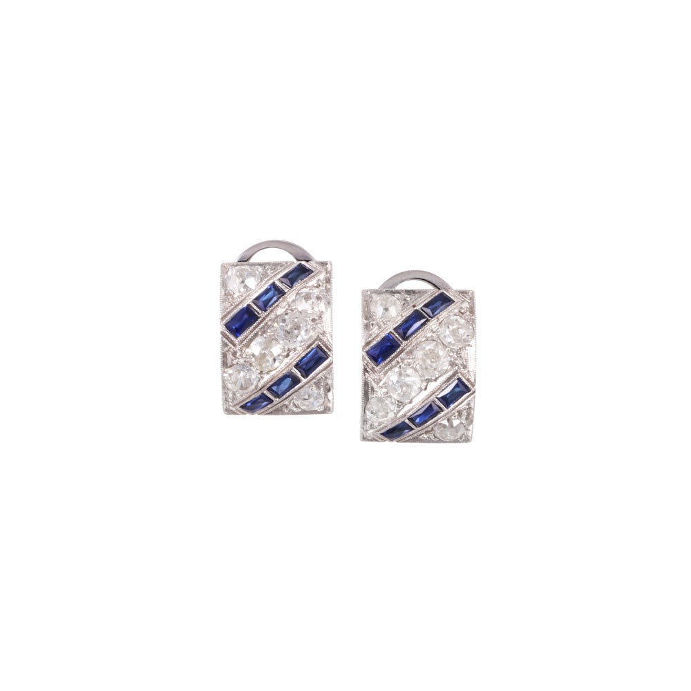 in platino, a forma rettangolare lievemente bombati con clip, ornati da diamanti taglio antico europeo e zaffiri sintetici, gr. 5,2.