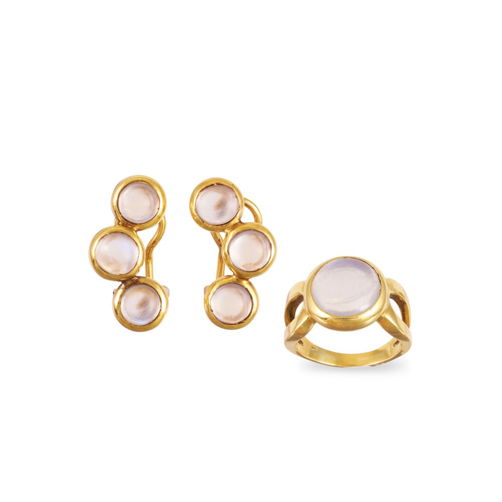 in oro giallo 18Kt, composta da anello e orecchini a clip con pietre di luna cabochon, gr. complessivi 18,5.