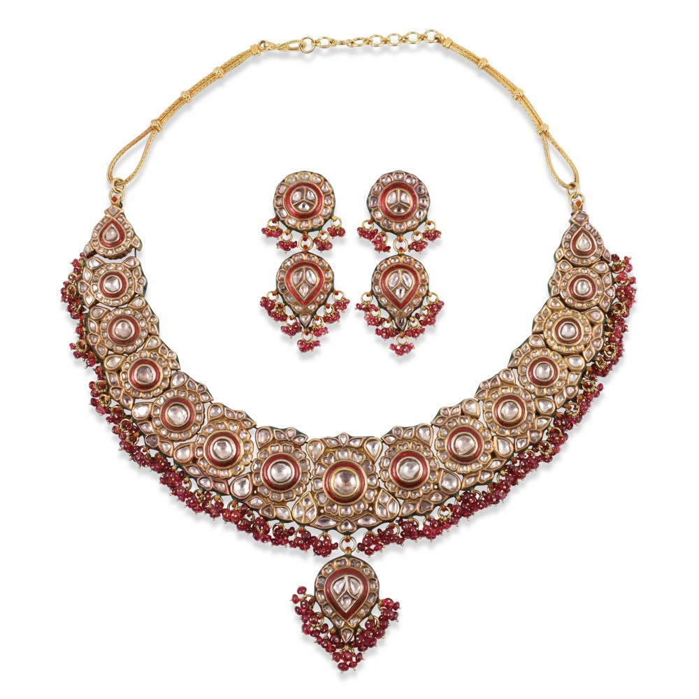 composta da collana e orecchini pendenti in oro giallo a titolo alto e smalto nei toni del rosso, bianco e verde, diamanti a rosa e sferette di rubino sospese, disposte a grappolo.