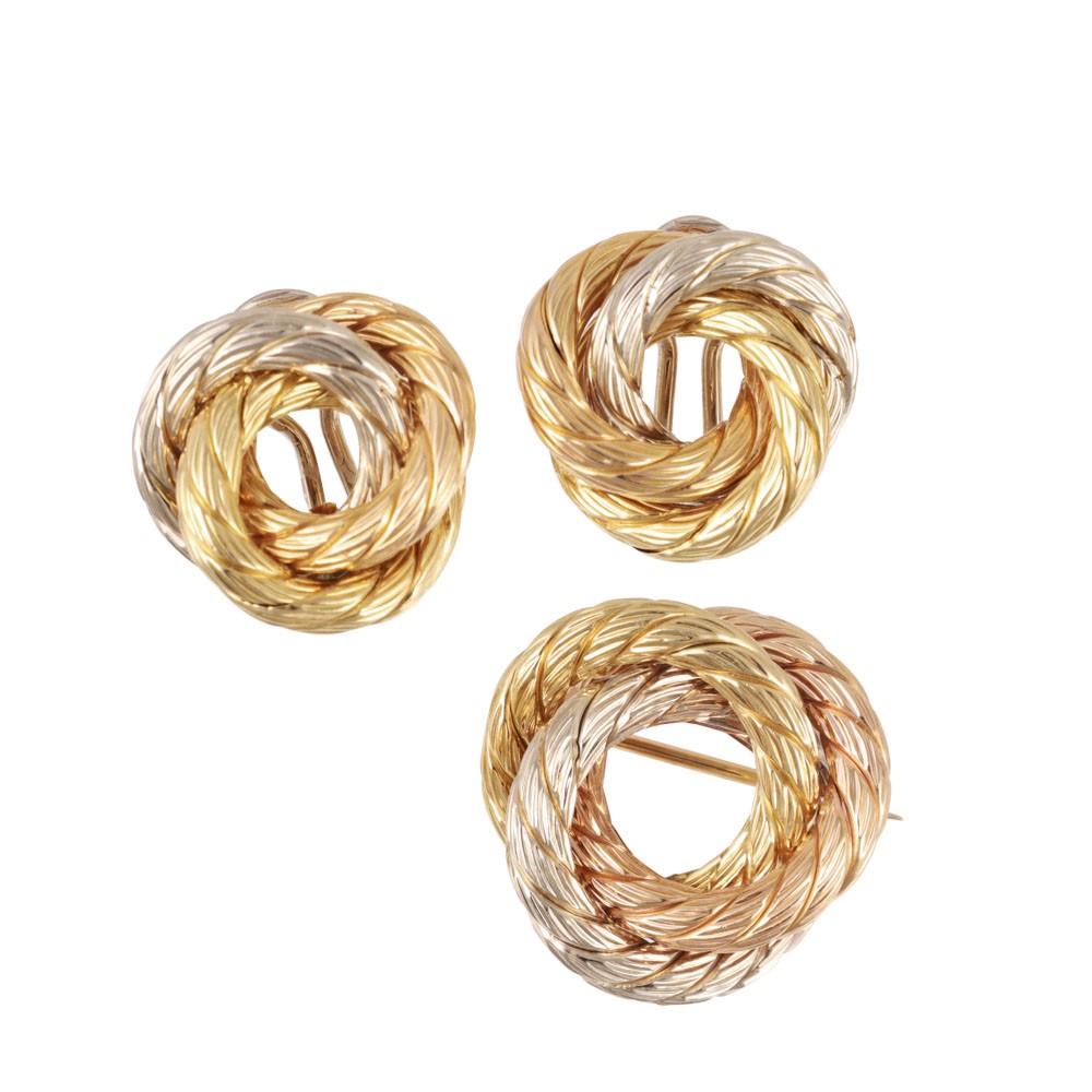 composta da spilla e orecchini, a cerchi che si intersecano in oro 18Kt a tre colori, gr. complessivi 23,7.
