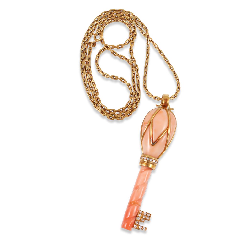 in oro giallo 18Kt e corallo, modellato a guisa di chiave impreziosito da piccoli diamanti (fêlure). Sorretto da una catena in oro 18Kt, gr. complessivi 42.