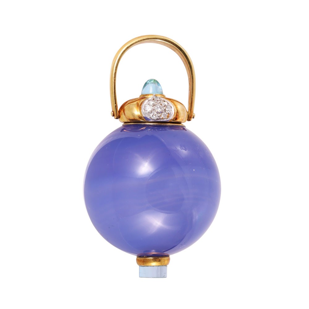 in oro giallo e bianco 18Kt, con sfera in calcedonio, brillanti e topazi azzurri ad ornamento.