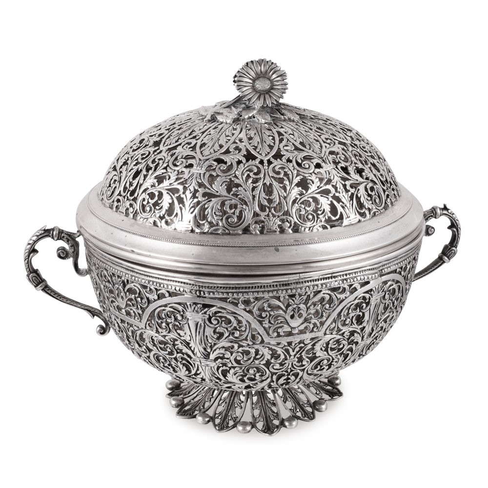 a coppa biansata con coperchio, in argento 800/1000, interamente traforati a motivi vegetali con fastigio modellato a guisa di margherite fogliate, ciotola interna in argento lucido 800/1000, gr. complessivi 1.140 ca. (difetti).