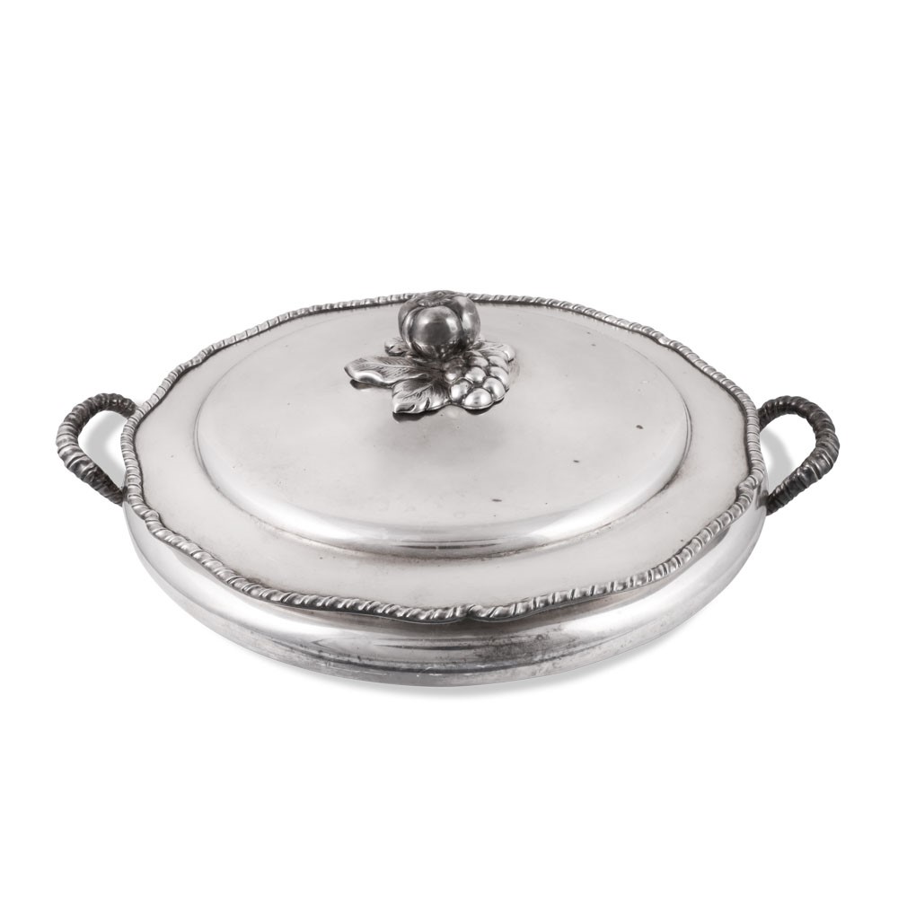 in argento 800/1000 a corpo circolare bombato con prese laterali godronate, coperchio abbinato con fastigio modellato a guisa di frutti fogliati, gr. complessivi 1.135 ca.