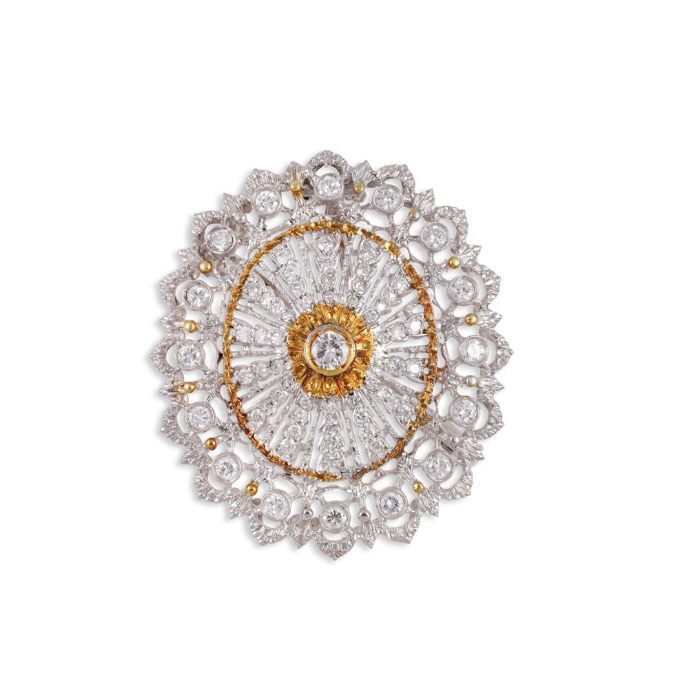 doppio uso, in oro 18Kt, a forma ovale finemente traforata, ornata da brillanti, gr. 10.