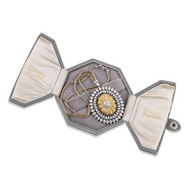 doppio uso, a forma ovale in oro giallo e bianco 18Kt finemente traforata e cesellata, ornata da brillanti; catena in oro giallo satinato con fermezza in oro bianco 18Kt ornata da brillanti, gr. complessivi 22,5. Corredata da custodia originale.