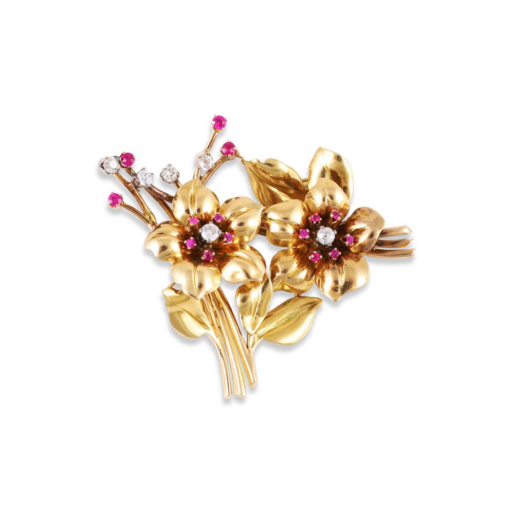 floreale, realizzata in oro giallo e bianco 18Kt, ornata da diamanti e rubini alcuni sintetici, gr. 14,9.