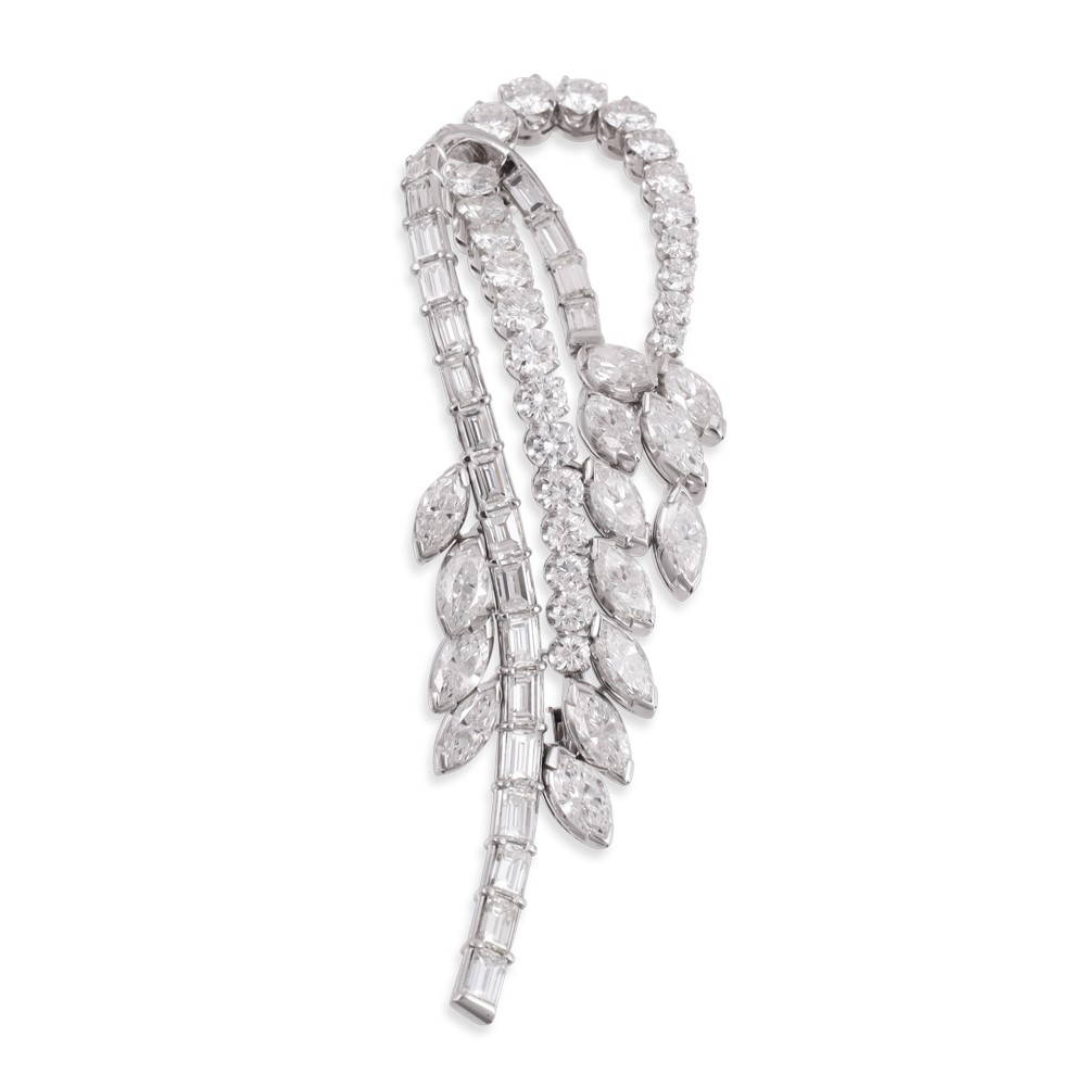 d'ispirazione vegetale, realizzata in platino, impreziosita da brillanti, diamanti taglio navette e baguette del peso complessivo di 10 ct ca., gr. 23,7.