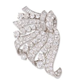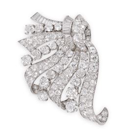 clip in platino, modellata a guisa di nastro, impreziosita da diamanti del peso complessivo di 16 ct ca., gr. 29,4.