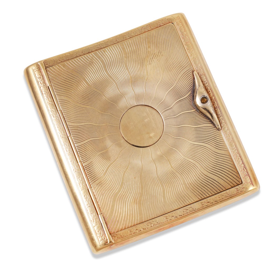 in oro 14Kt, a forma rettangolare con sole inciso e cornice a motivo floreale (mancanza), gr. 104.