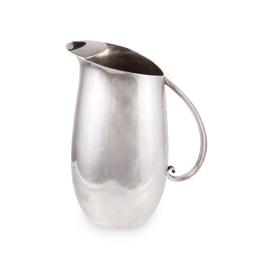 in argento 925/1000 a corpo liscio leggermente bombato con manico a nastro, gr. 670 ca.