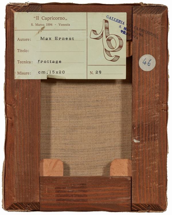 MostreEtichette: “Il Capricorno” S. Marco 1994 - Venezia Autore: Max Ernest. Tecnica: frottage. Misure: cm 20 x 15, n. 29PubblicazioneMax Ernst ŒUVRE-KATALOG, WERKE 1964-1969 - Menil Foundation, Inc., Houston, Texas DuMont Literatur und Kunst Verlag, Caspar H. Schübbe.4082 Ohne TitelTechnik: Frottage, Farbstift auf PapierBezeichnet: rechts unten »to Peggy happy happenings in 1966 max«Datierung:1965Besitzer: Privatsammlung, ParisAusstellungen: Boisserée 2201, Nr. 7, farb. Abb.Abgebildet in: Auktionskat. Drouot Montaigne Paris, 15. 6. 1998, farb. Abb. Nr. 67 A; Kat. >Boisserèe 2001<, farb. Abb.; Auktionskat. 277, Wolfgang Ketterer München, 6. 12. 2002, farb. Abb. Nr. 185; Auktionskat. Catherine Charbonneaux Paris, 18. 6. 2003, farb. Abb. Nr. 47