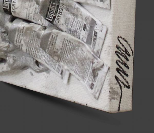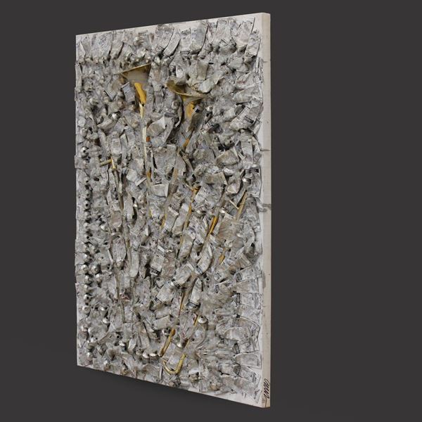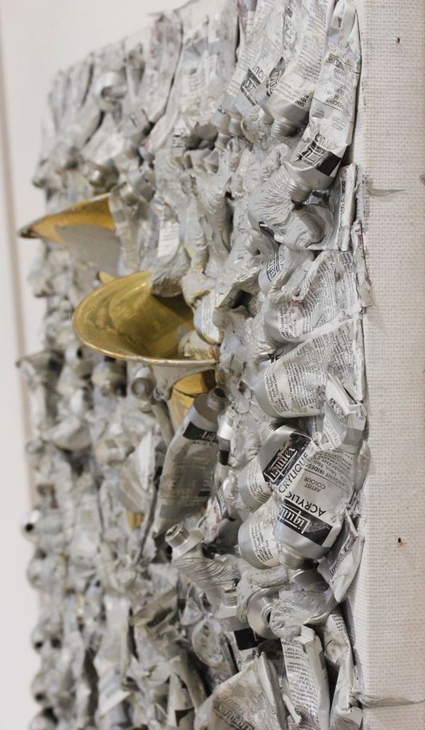 Applicazione su tela (tubetti colore, parti di strumenti musicali)