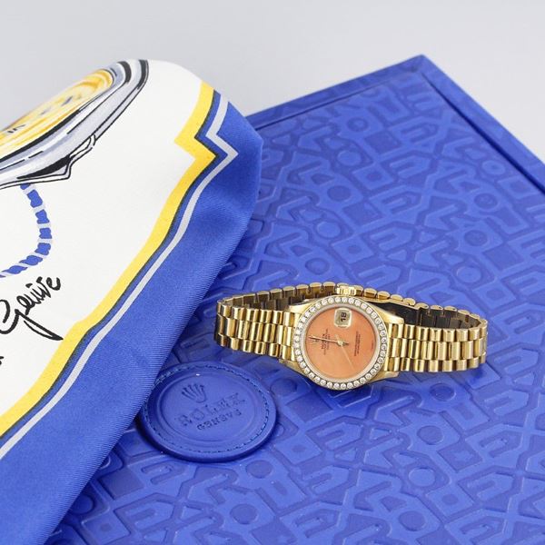 Fine, self-winding, water resistant, 18K yellow gold lady’s wristwatch with diamonds bezel, coral dial and original President bracelet with deployant clasp