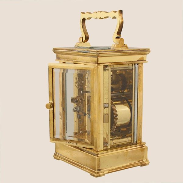 Fine, miniature, gilt brass, 8-day going carriage clock with alarm