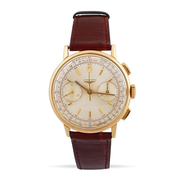 Fine and rare, 18K pink gold chronograph wristwatch with tachometer and telemeter scale