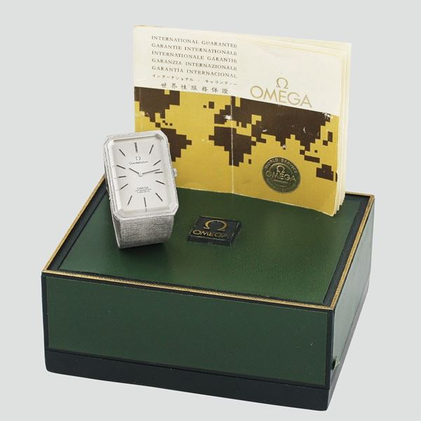 Fine, rectangular curved, self-winding, 18K white gold wristwatch with an integrated and textured 18K white gold Omega bracelet and clasp.