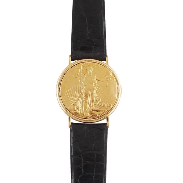Very fine, 18K yellow gold $20 U.S. coin dated 1908 with concealed watch and original gold buckle