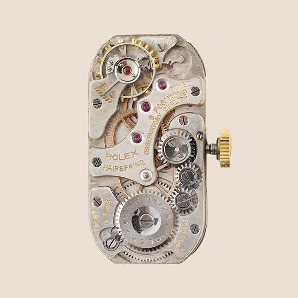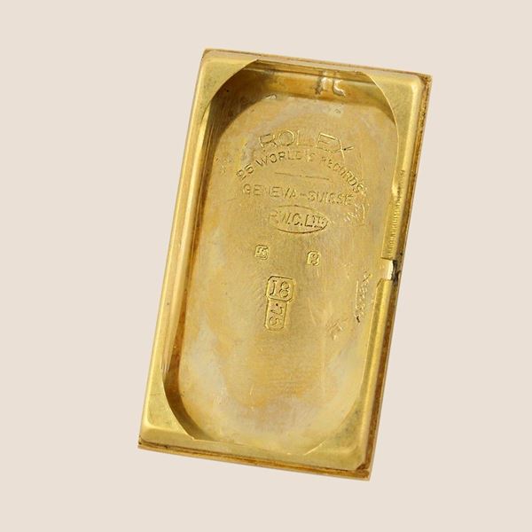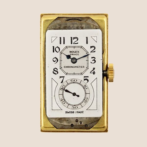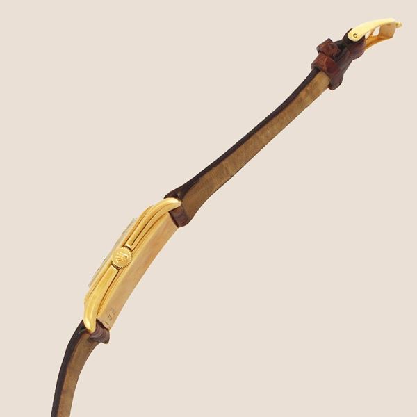 Fine and rare, rectangular curved, flared, 18K yellow gold doctor’s wri- stwatch with gold original crown and buckle. Made circa 1930