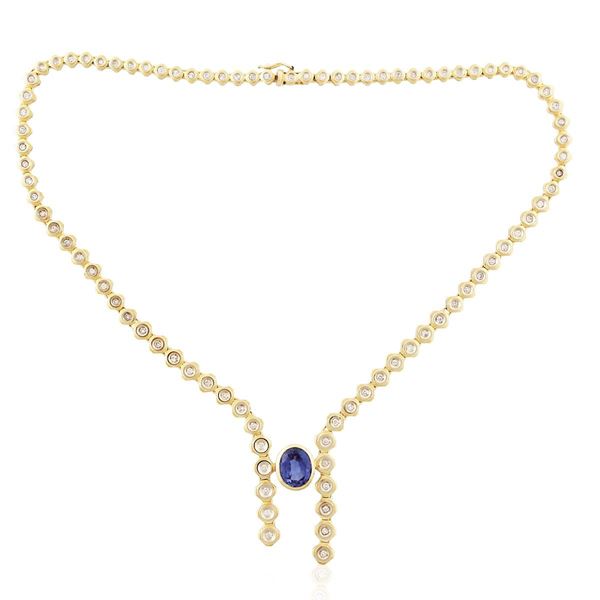 PAIR OF DIAMOND, SYNTHETIC SAPPHIRE AND GOLD EARRINGS AND NECKLACE