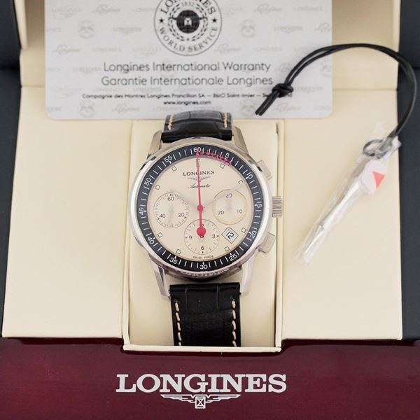Fine, water-resistant, self-winding, stainless steel wristwatch with square button chronograph, registers, date and a stainless steel Longines buckle. Accompanied by a Longines box, setting-pin, Guarantee and instruction manual. Made circa 2010