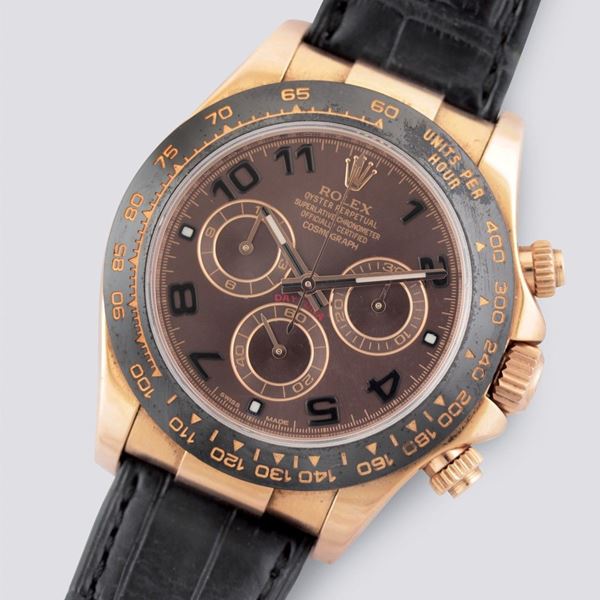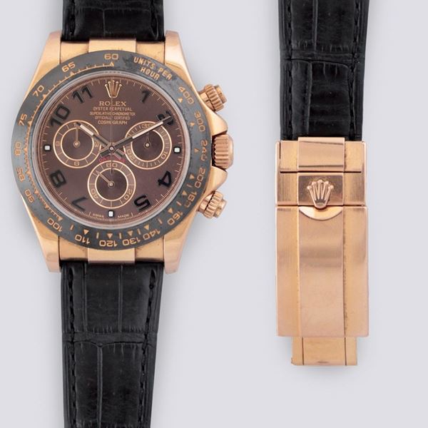 Very fine and rare, self-winding, water-resistant, 18K pink gold wristwatch with round button chronograph, registers, tachometer and an 18K pink gold Rolex deployant clasp.