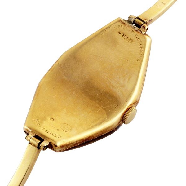 A fine and rare, 18K yellow gold tonneau-shaped lady’s wristwatch with hinged case, 18K gold elastic Gay Freres bracelet and movement numbers stamped on the back, No. 169053.