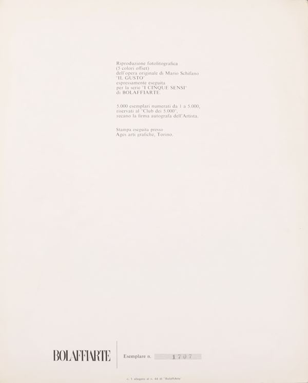 Riproduzione fotolitografica (5 colori offset) dell'opera originale di Mario Schifano "IL GUSTO" espressamente eseguita per la serie "I CINQUE SENSI" di BOLAFFIARTE.
