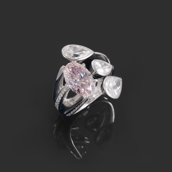 18KT GOLD RING WITH 5,02 CT FANCY LIGHT PINK OVAL-SHAPED DIAMOND, AND COLORLESS DIAMONDS, BY SCAVIA