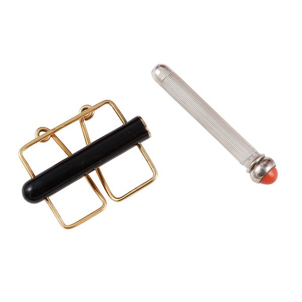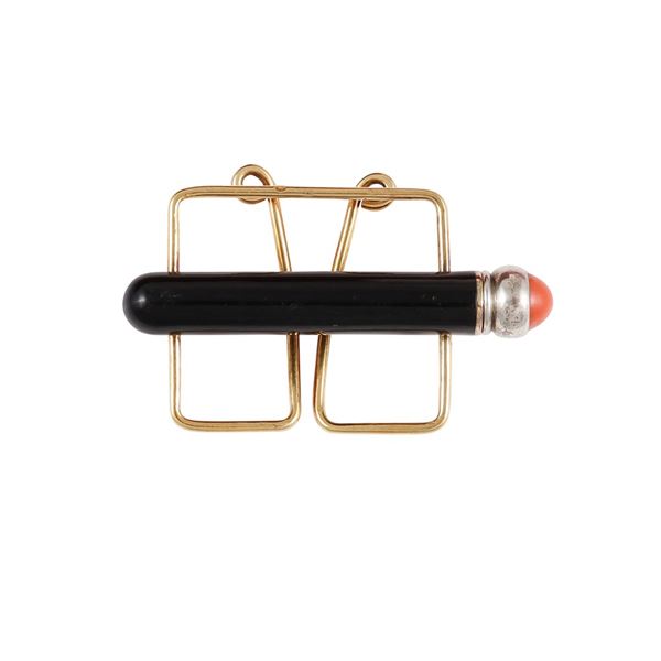 black suede, with 18KT and silver brooch with enamel and coral (pencil inside)