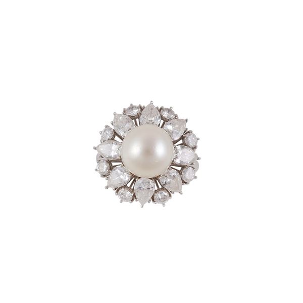PLATINUM, CULTURE PEARL AND DIAMONDS RING