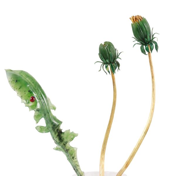 SCULPTURE WITH FLOWERS AND LEAVE IN GOLD, JADEITE, ENAMEL (missing) AND A QUARTZ VASE, BY GENNADY PYLIN "Dantelion"