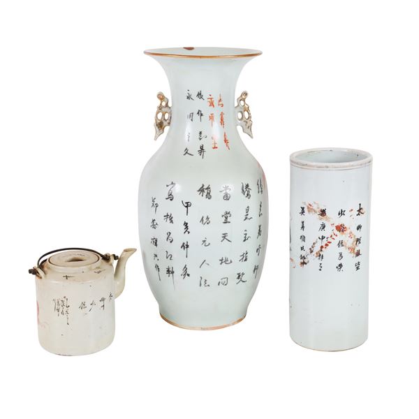 LOT - 清 矾红狮子 花瓶 帽筒 茶壶 共三件