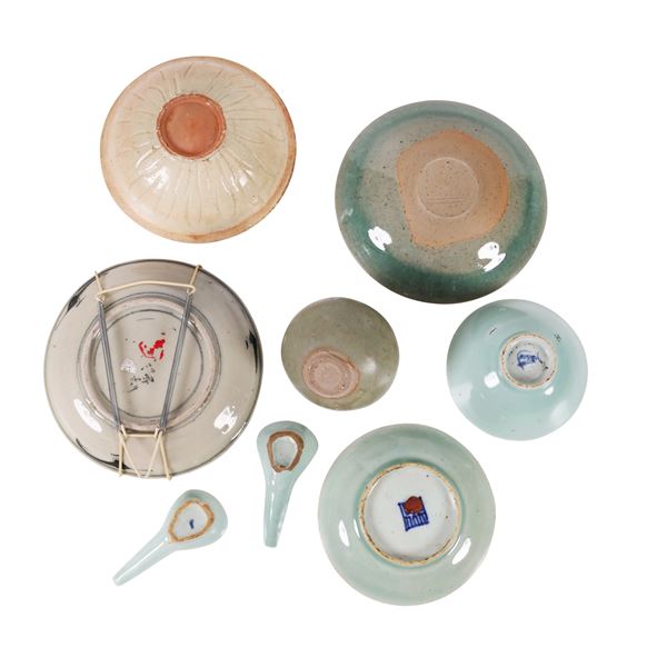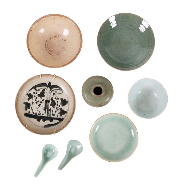Made of three porcelain plates, two porcelain bowls, one small porcelain vase and two porcelain spoons.