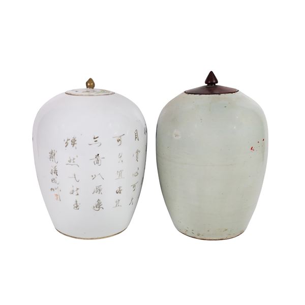 PAIR OF VASES - 清 粉彩博古罐及青花罐
