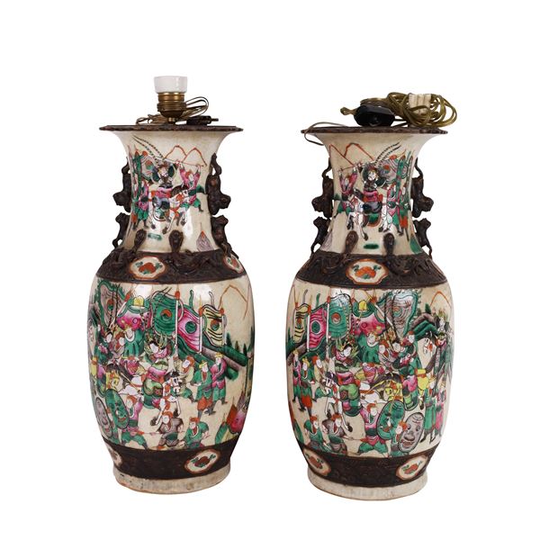 PAIR OF VASES - LAMPS - 清 哥釉粉彩人物瓶一对