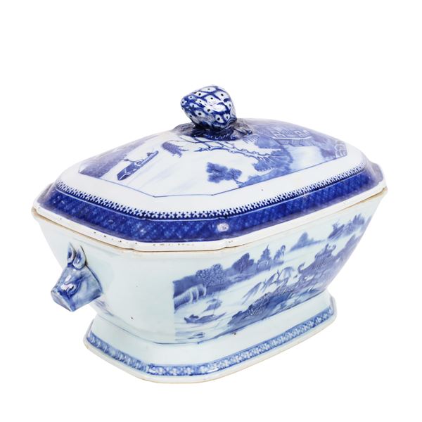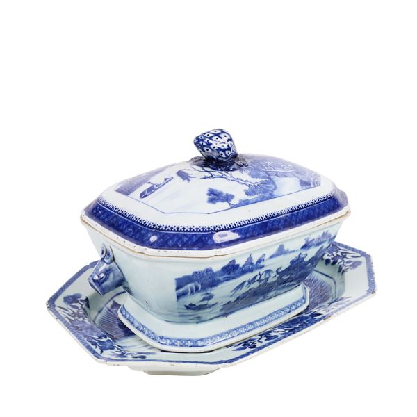 TUREEN, TRAY AND COVER - 清 青花山水人物盆带托盘