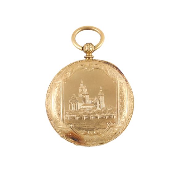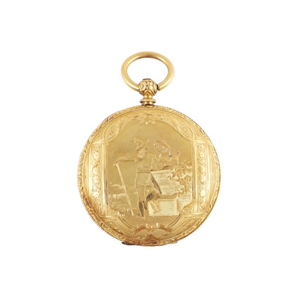 Fine, 18K yellow gold savonette pocket watch with pastoral scenes engraved on the case. Accompanied by a gold chain
