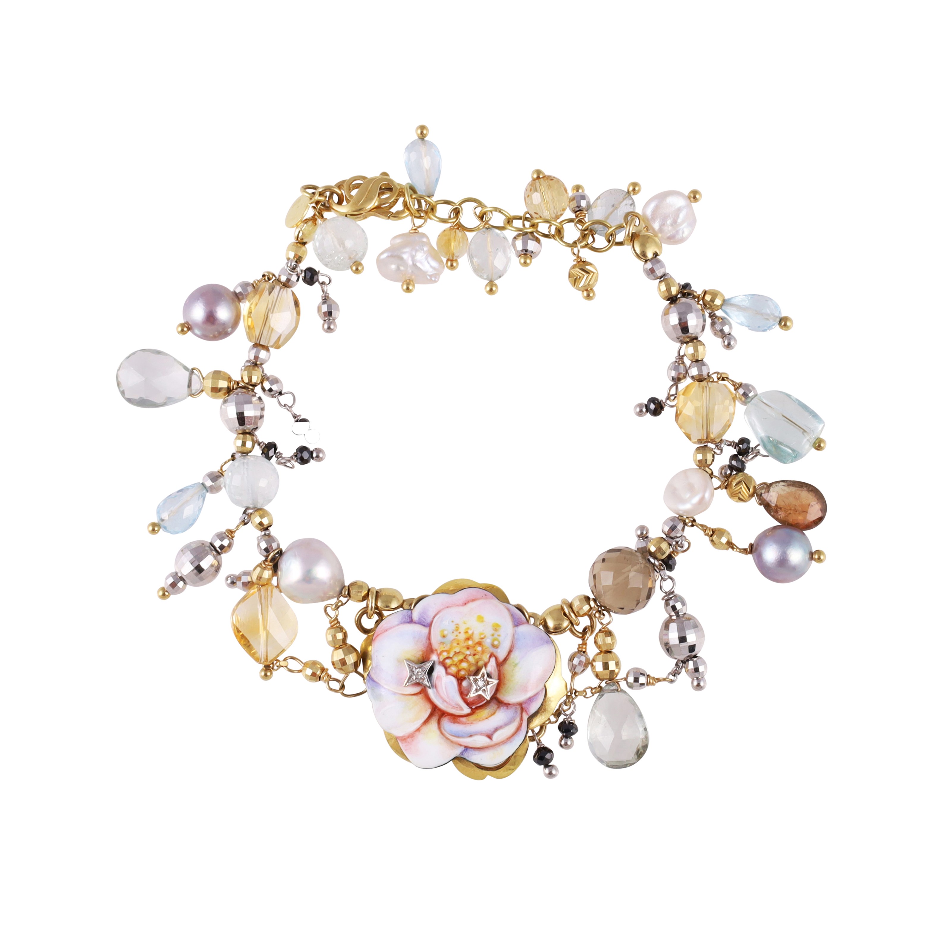 * 18 KT GOLD, COPPER, FRESHWATER PEARLS, GEMSTONES, ONYX, DIAMONDS AND ENAMEL BRACELET, GABRIELLA RIVALTA