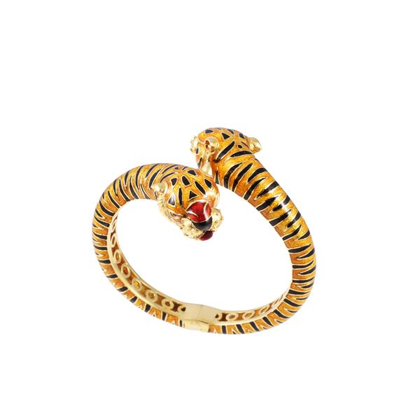 18KT GOLD BRACELET WITH OPPOSING TIGER HEADS, RUBY EYES AND ENAMEL, BY FRASCAROLO