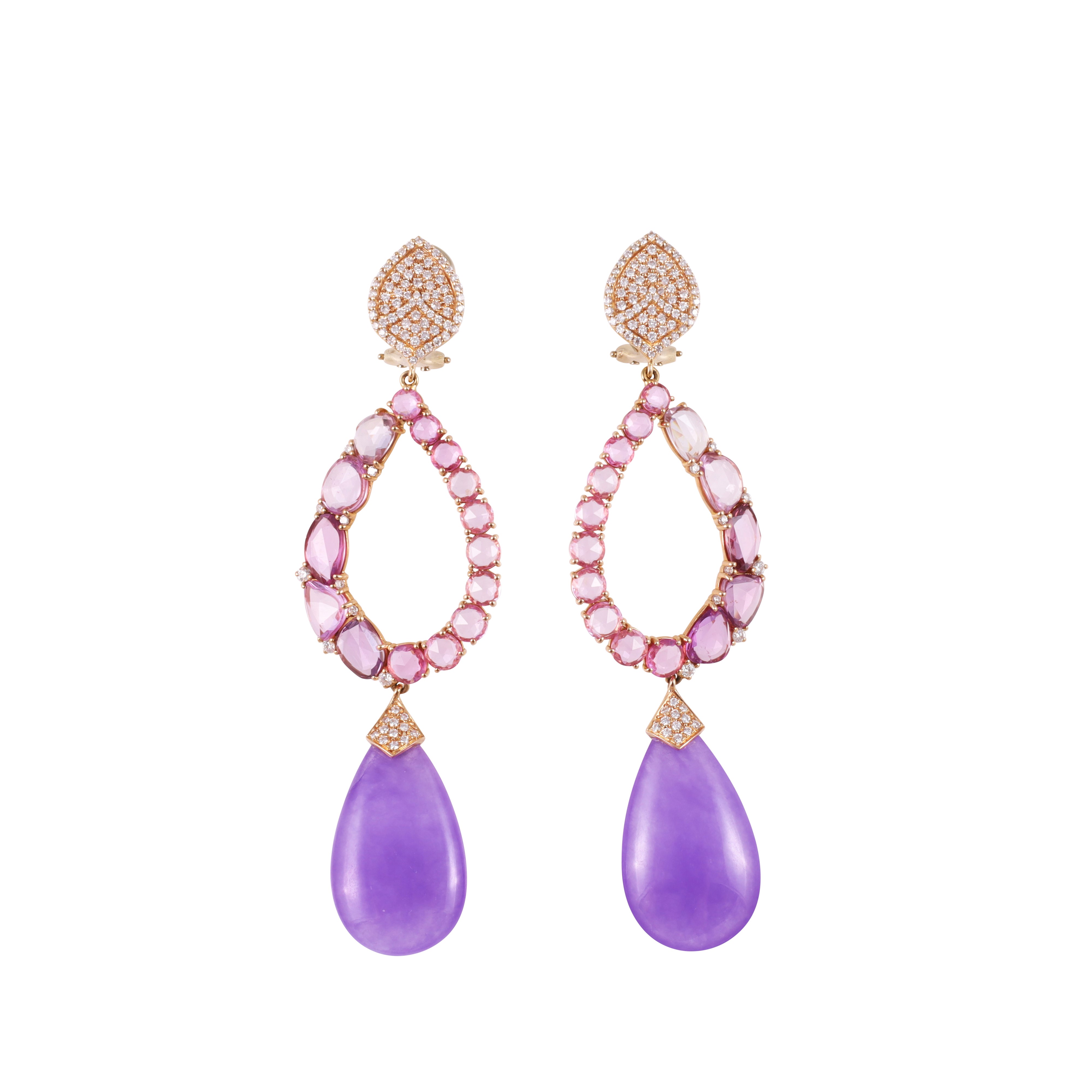 18KT GOLD EARRINGS WITH DIAMONDS, PINK SAPPHIRES AND CHALCEDONY