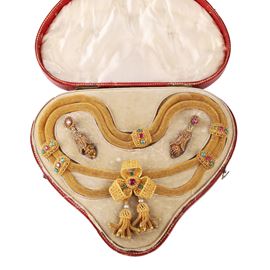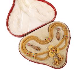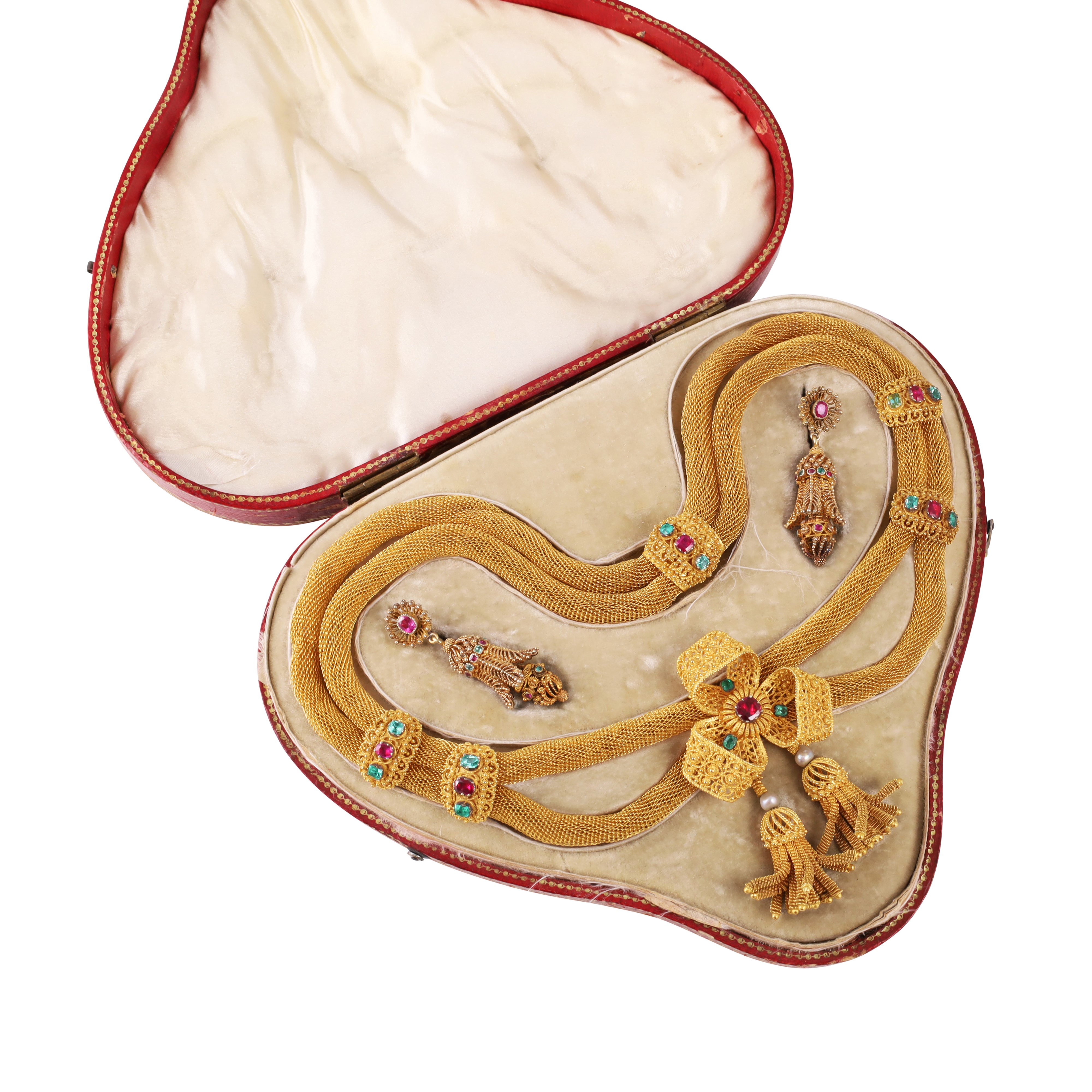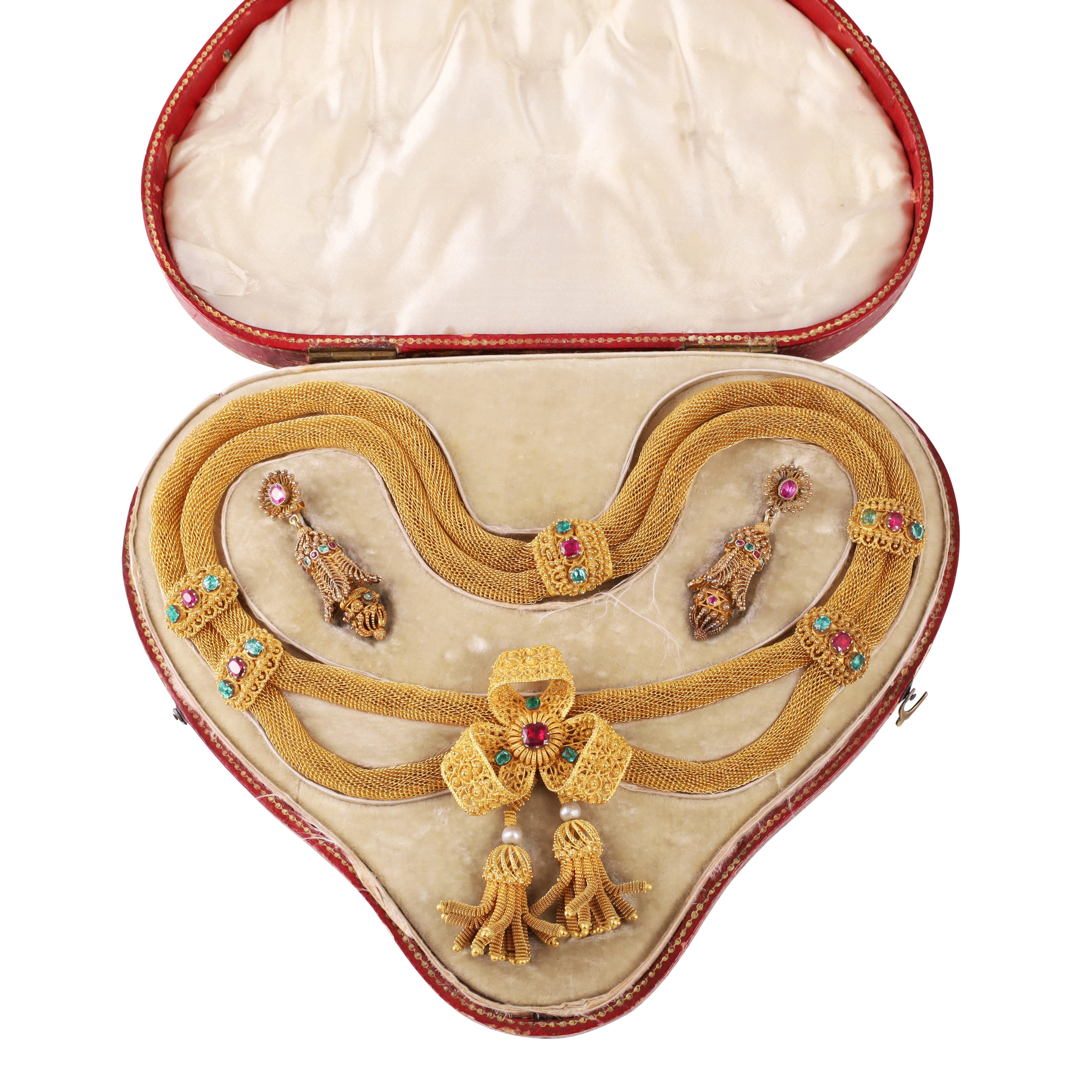 18KT GOLD NECKLACE AND GOLD AND SILVER EARRINGS WITH RUBIES, EMERALDS AND PEARLS