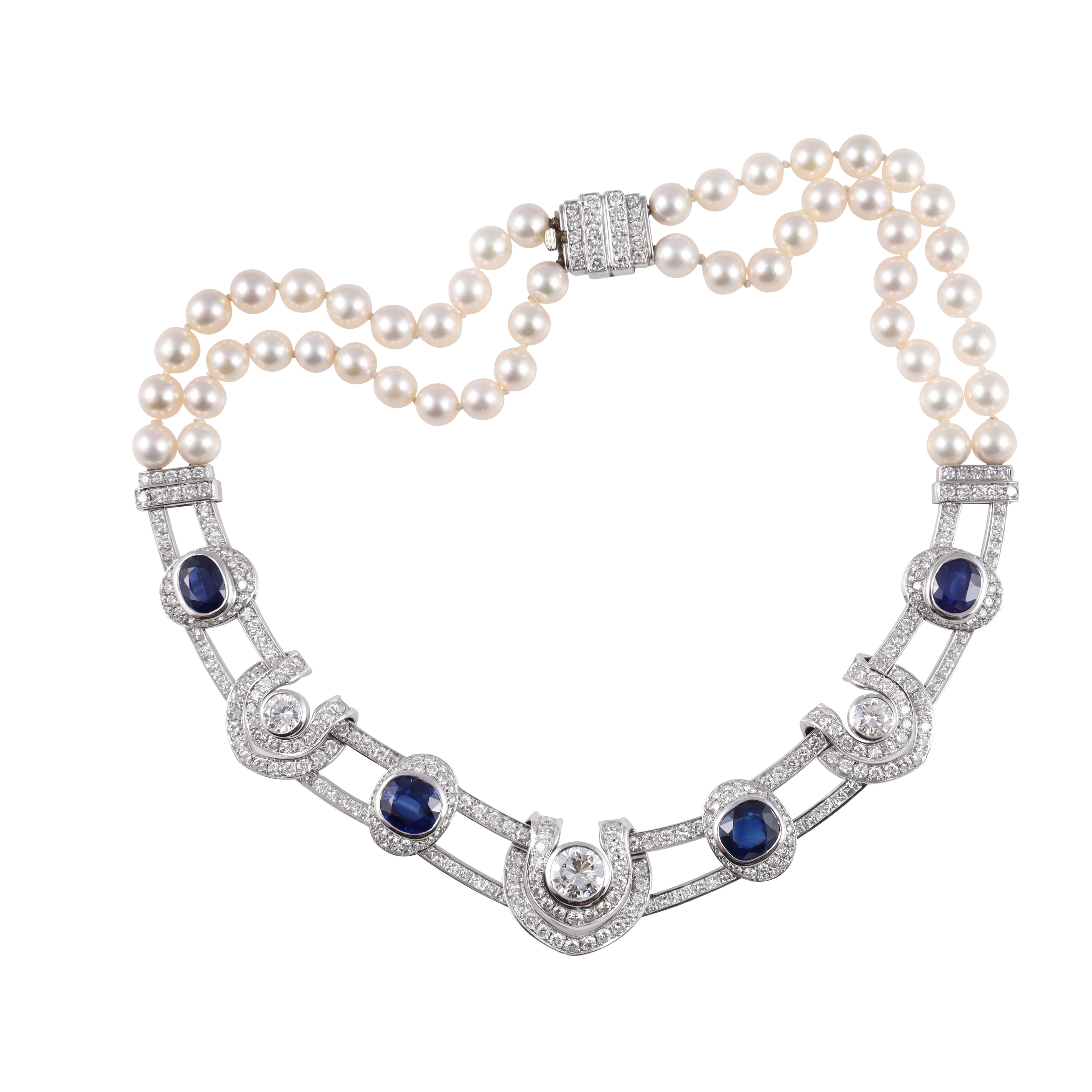 18KT GOLD NECKLACE WITH SAPPHIRES, DIAMONDS AND CULTURED PEARLS