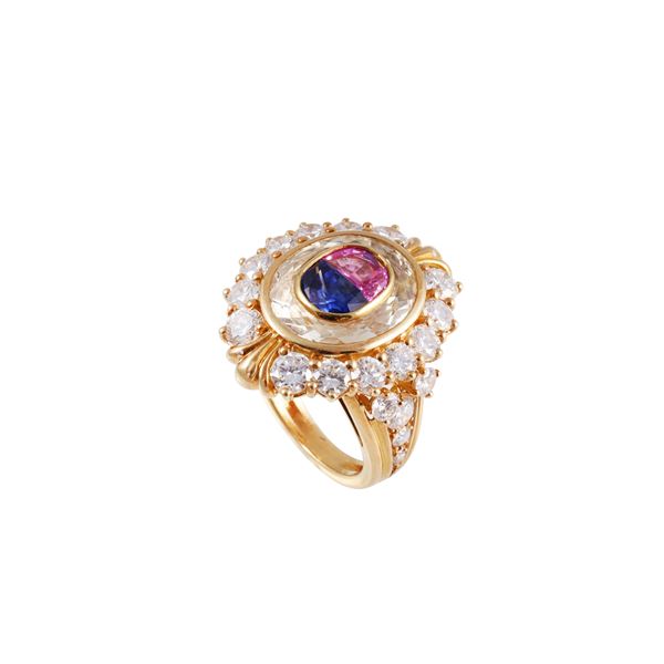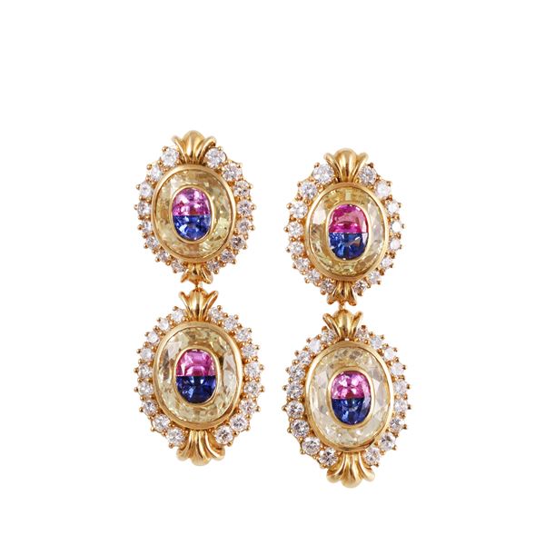 18KT GOLD PARURE OF NECKLACE, BRACELET, EARRINGS AND RING SET WITH DIAMONDS, BLUE, PINK AND YELLOW SAPPHIRES, BY HARRY WINSTON