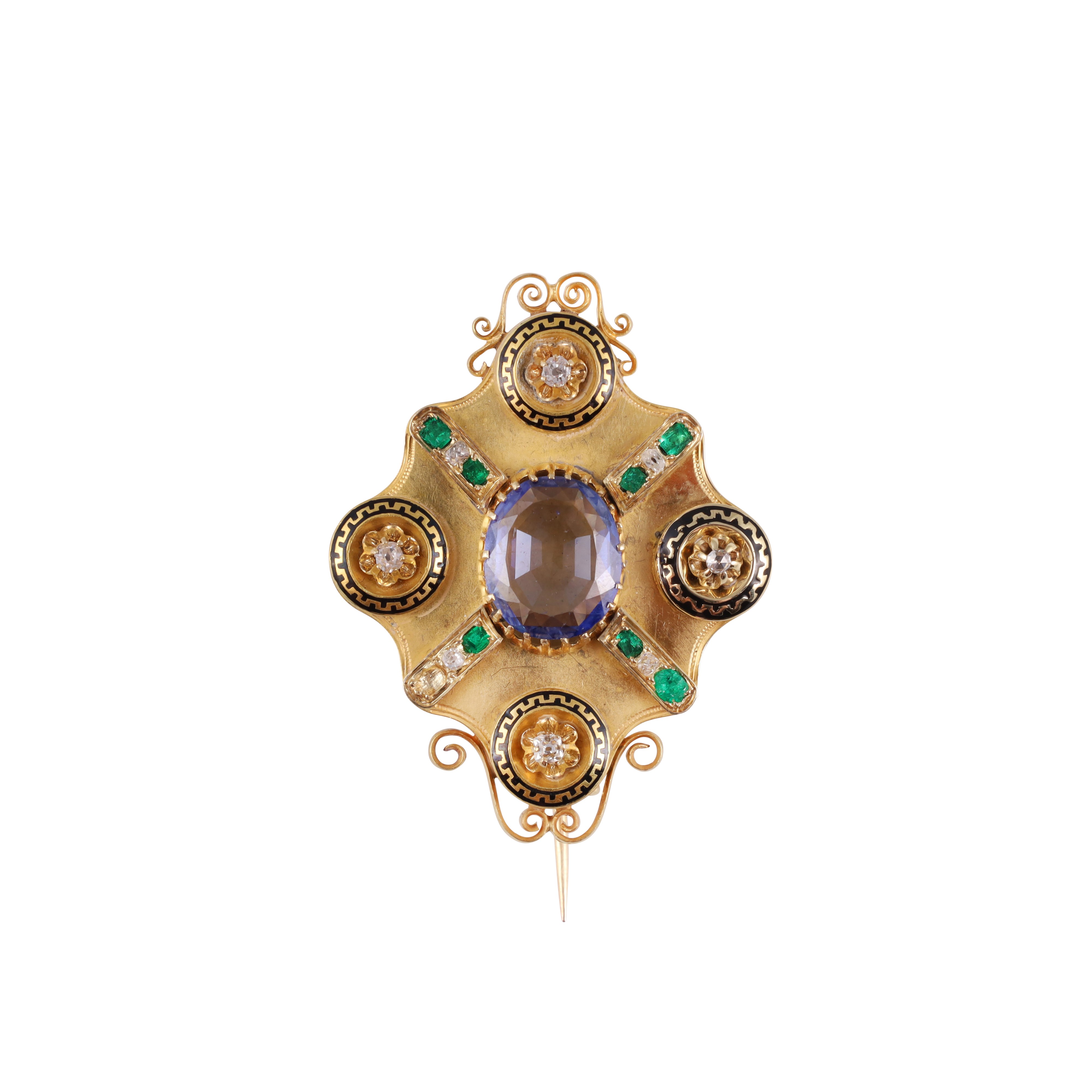 18KT GOLD PHOTO FRAME BROOCH WITH SAPPHIRE, OLD CUT DIAMONDS, EMERALDS (one missing) AND ENAMEL