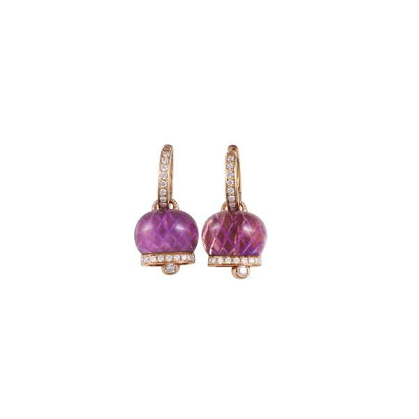18KT GOLD EARRINGS WITH ENGRAVED AMETHYST AND DIAMONDS, BY CHANTECLER "Campanelle"